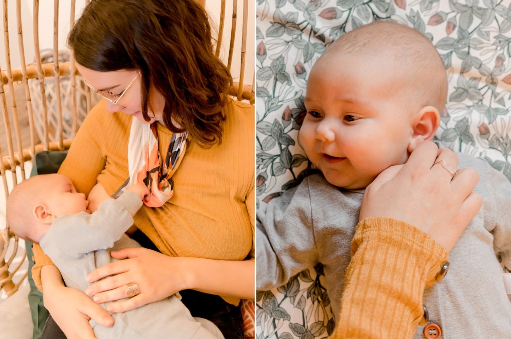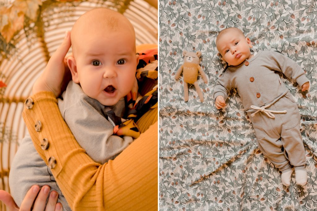 Lorsque Léa est venue avec Lila May pour cette séance photo, nous nous connaissions déjà très bien puisque nous sommes amies et que je l’ai accompagnée en tant que doula. J’avais déjà réalisé les photos pour sa grossesse. Pour cette séance du mois d’octobre, nous avons choisi des couleurs automnales et Léa portait un pull jaune, une couleur qu’elle affectionne particulièrement. Lila May portait une combinaison grise avec des boutons en bois naturels, ces petits détails intemporels tellement mignons.